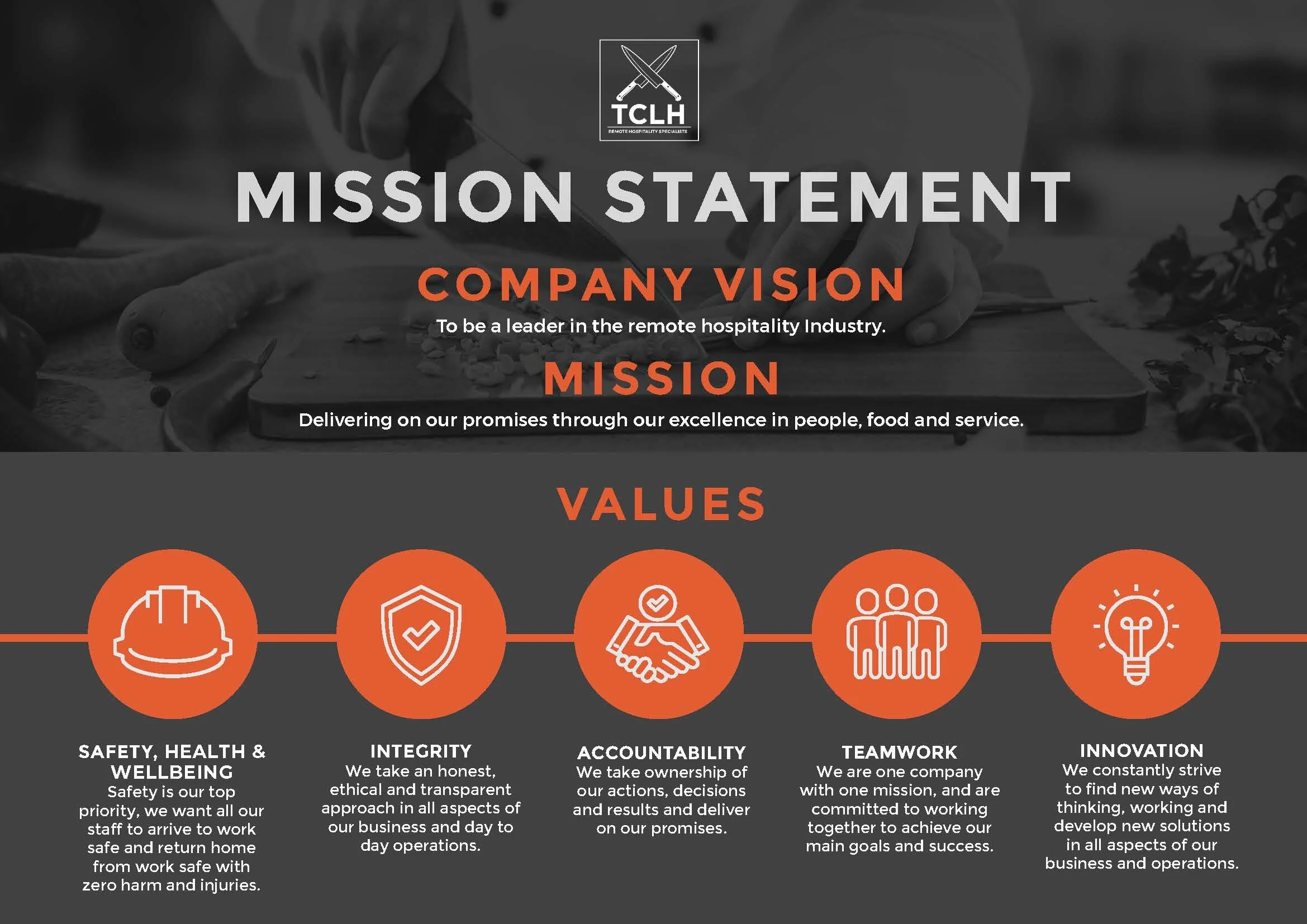 The core ingredient at TCLH is our people, our number one asset. Our company culture is attributed to our team consisting of young, energetic and motivated members that strive to serve and satisfy our clients and their crews. Combining their experience and extensive knowledge stemming from years in the fine dining, hotel, remote hospitality and resources sectors, Co-Director’s Craig Johnston & Lucy Johnston have built TCLH from the ground up with the knowledge, experience and understanding of what resources our people need along with the type of end to end service that our customers deserve.
